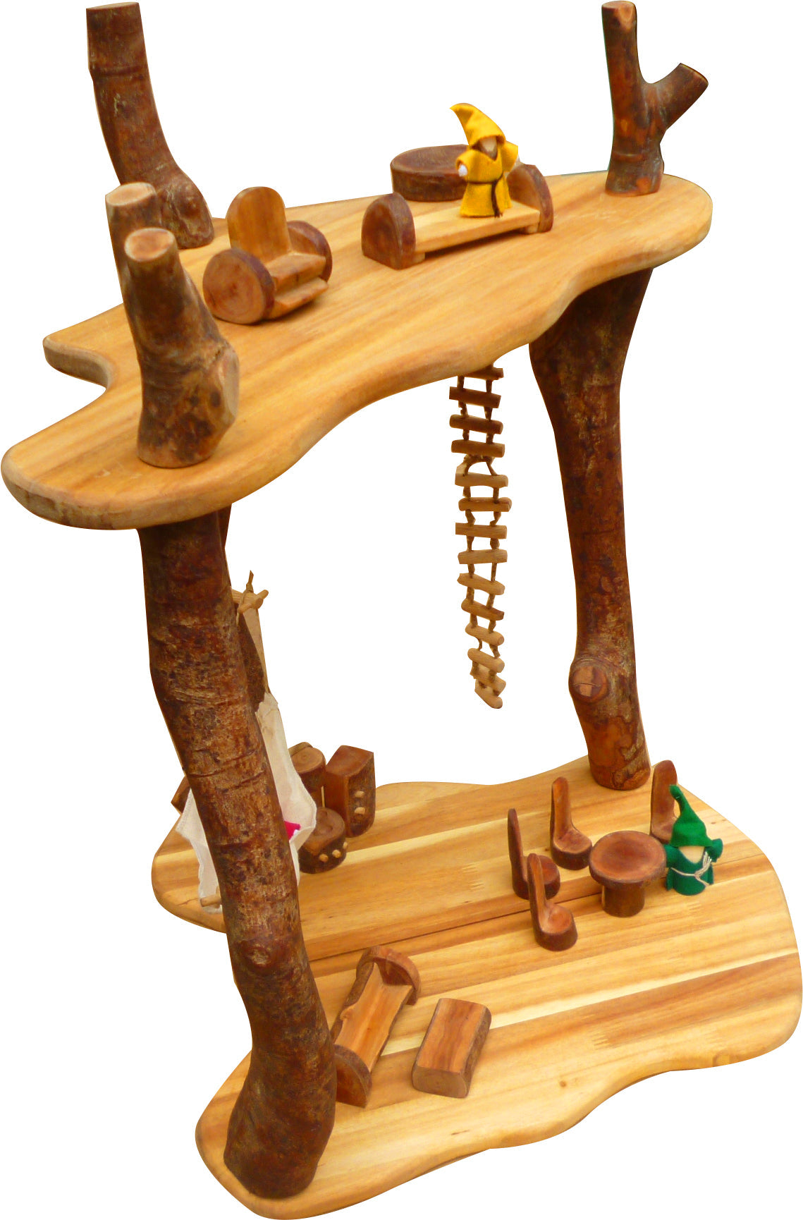 Good size tree house made out of Lychee branches and Acacia wood. The set (50x55x53cm high) comes with all accessories and dolls as per photo. Dolls' colours are random. It is great toy for imaginative play. All toys is made of plantation timber, using non toxic, child safe materials.