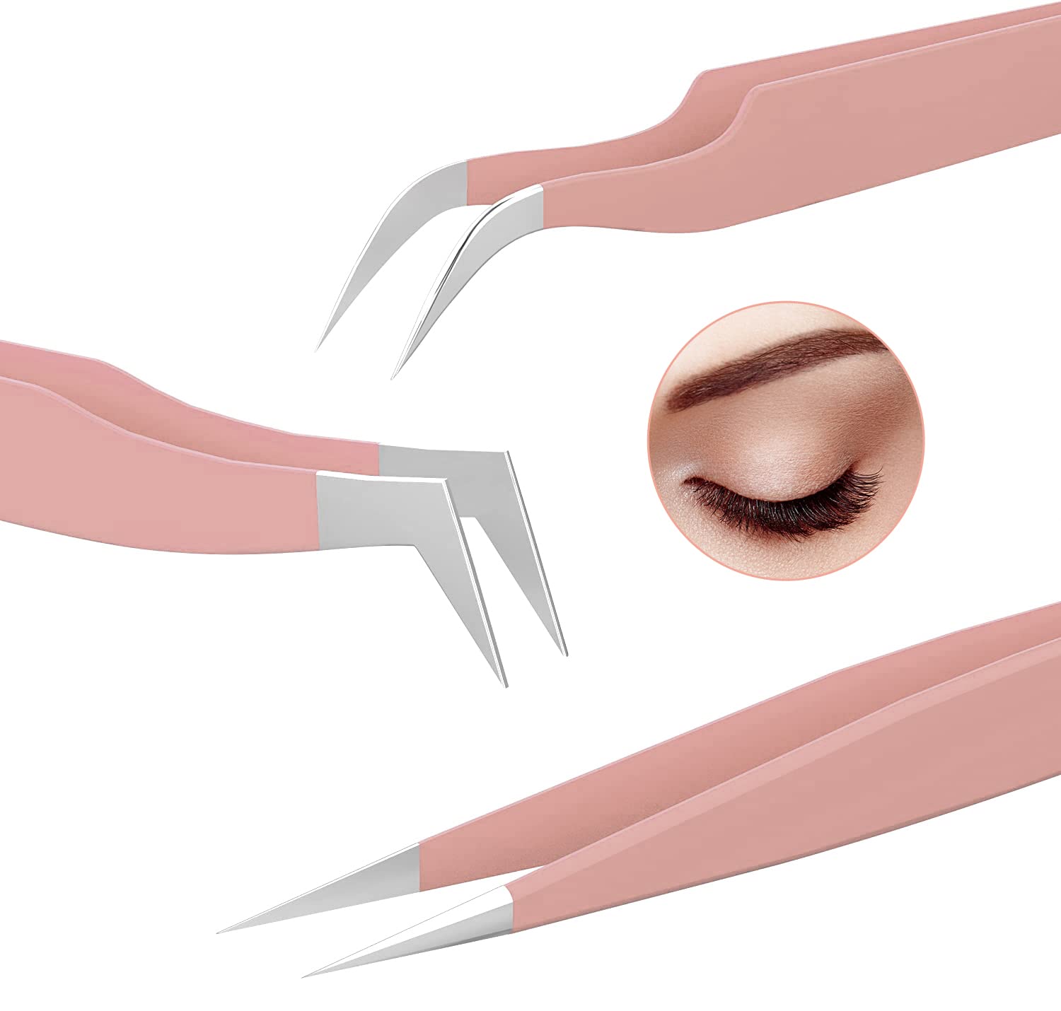 LANKIZ Eyelash Extension Tweezers Set 3 PCS for Volume Lash Extensions,High Precision Stainless Steel Lash Tweezers for Classic Individual Eyelash Extensions-Rose Gold